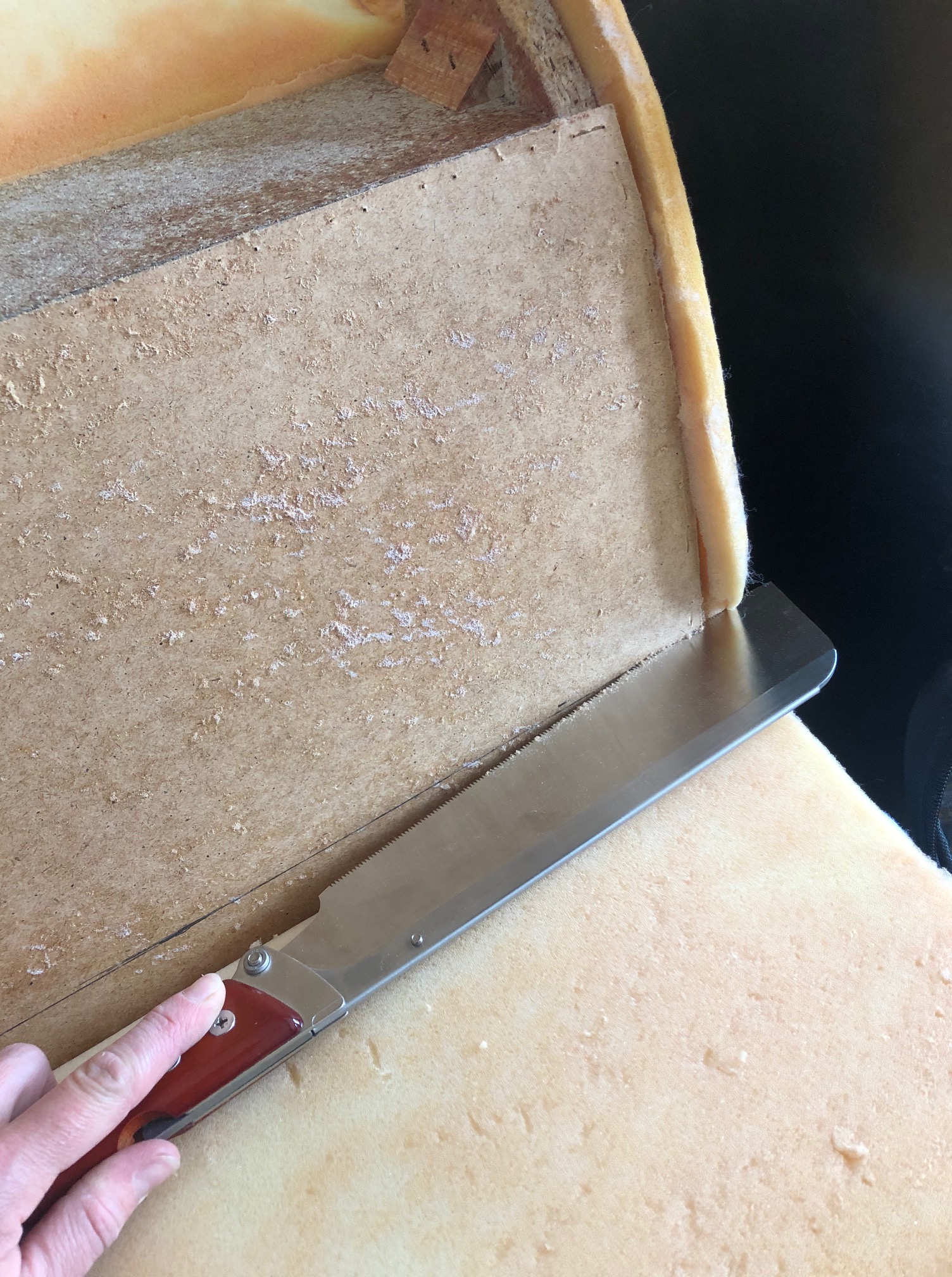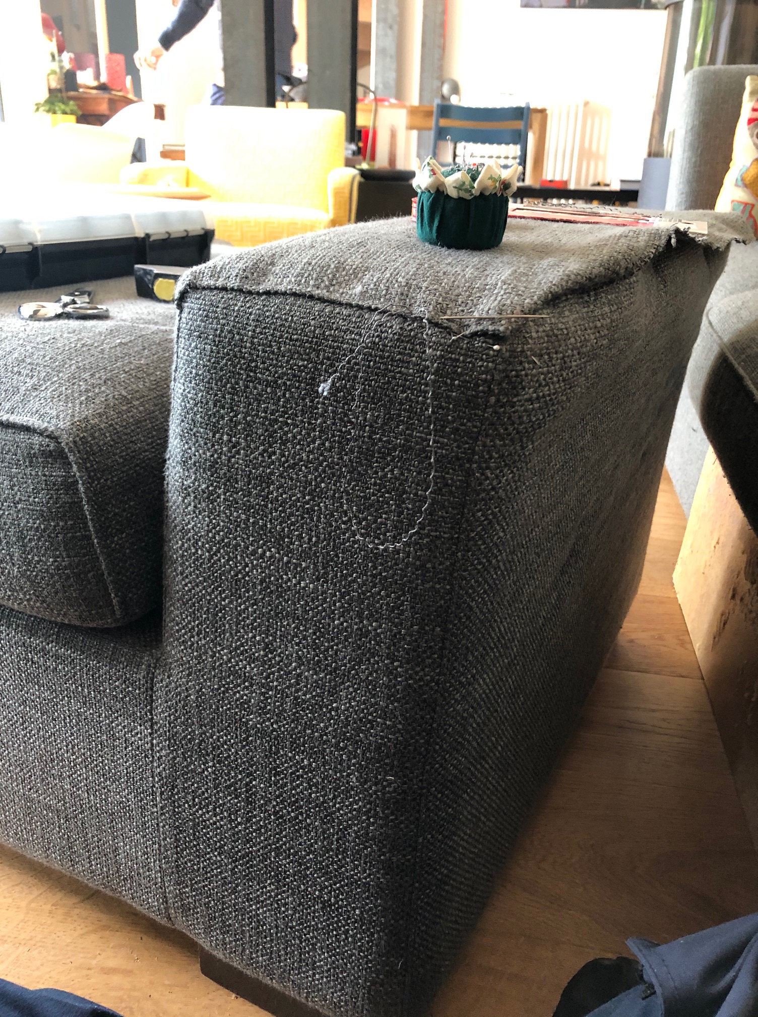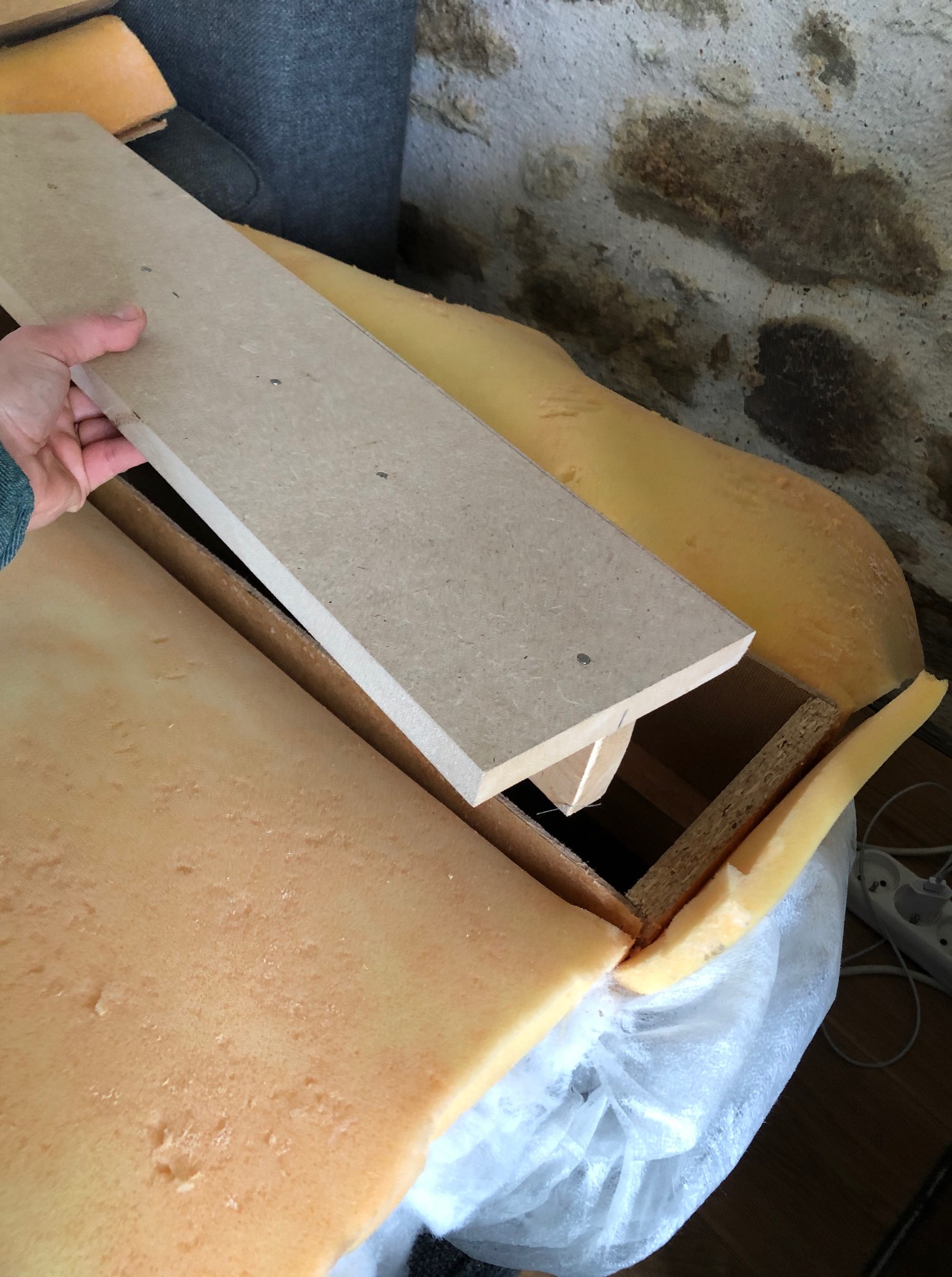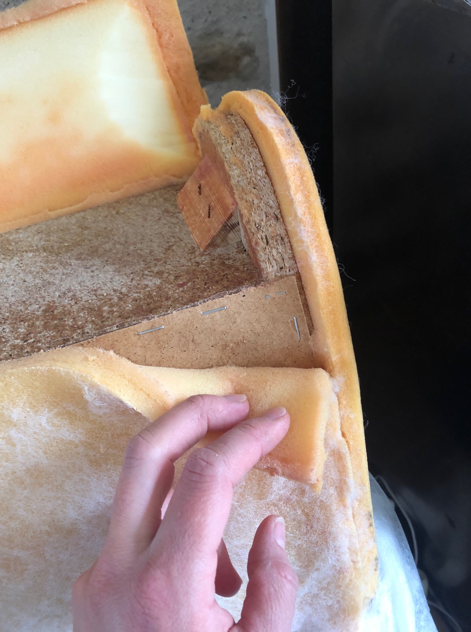 C’était une première que je découpe un canapé et que j’en vois l’intérieur. L’opération s’est très bien passée. Découdre, couper les mousses, dégraffer un médium 5mm, couper la structure en bois, adapter à la hauteur désirée le renfort, puis remettre toutes les couches de mousses. Petite couture à la main pour finir : ni vu ni connu !