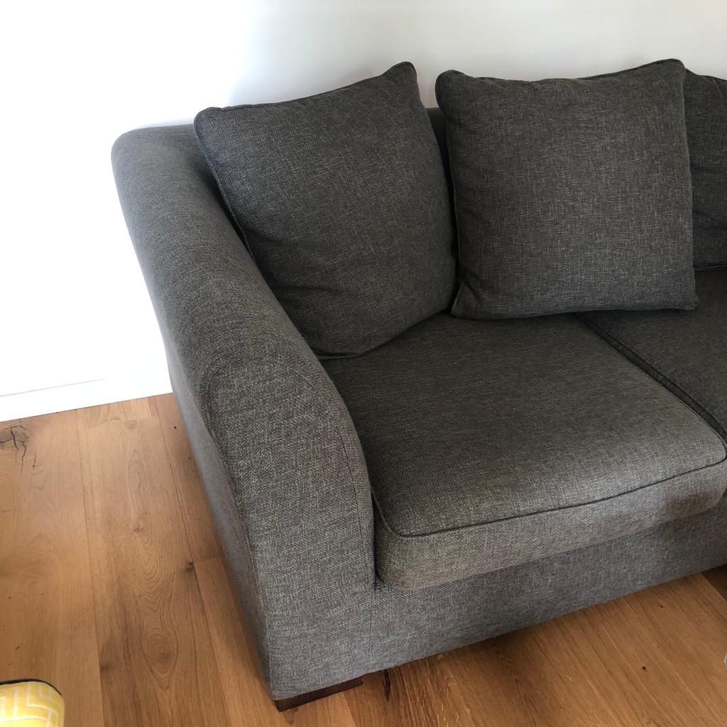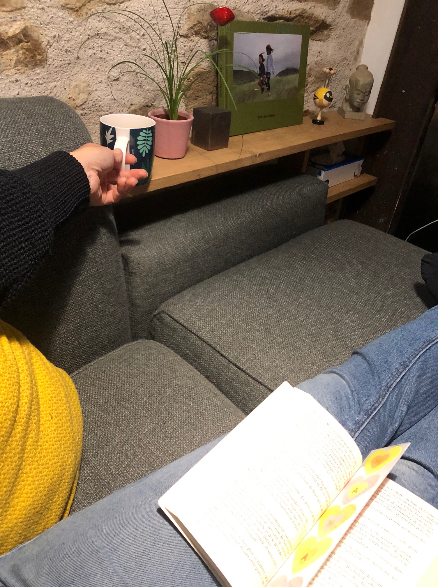 Je commence ici avec comme support un canapé d’angle qui a de très hauts accoudoirs. Il meuble ce salon depuis maintenant 10 ans : envie de lui donner une nouvelle jeunesse, un petit goût de neuf. Côté poêle à bois, j’ai envie d’avoir un accoudoir plus bas pour profiter d’une belle flambée le soir. De l’autre côté, on allège aussi la méridienne en coupant le dossier qui vient s’intégrer sous une étagère. Le résultat permet de mieux profiter du mur en pierres apparentes avec une petite déco à personnaliser.