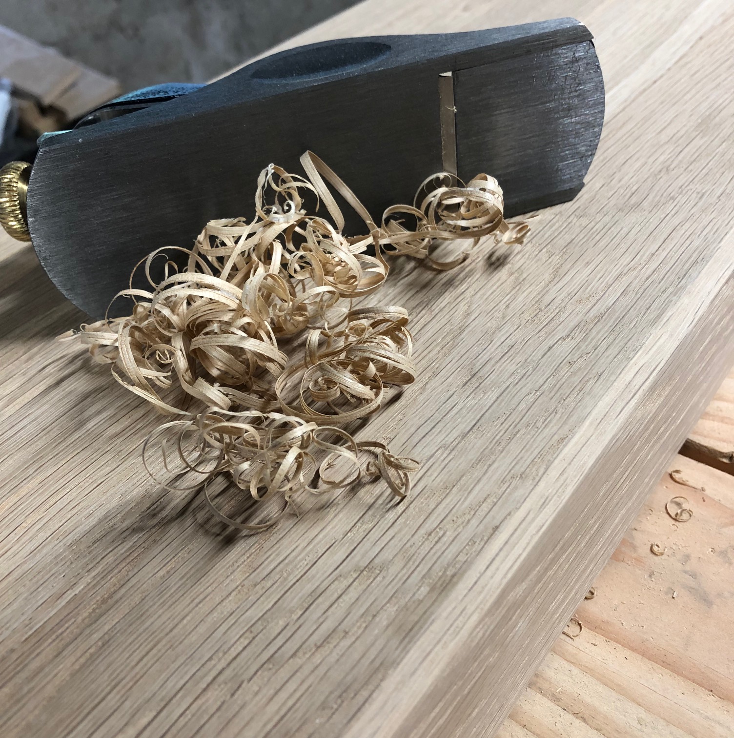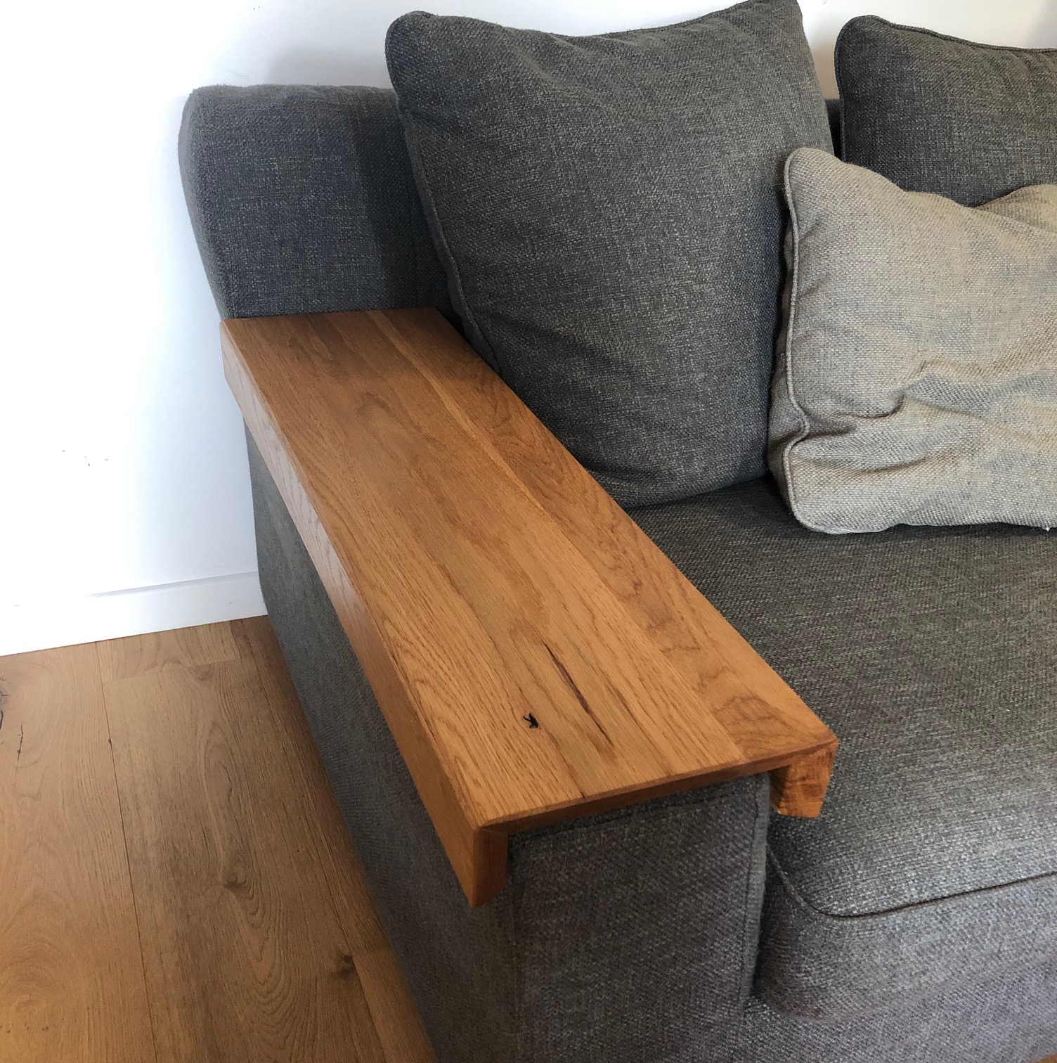 Côté poêle à bois, j’ai créé une tablette en chêne. L’assemblage est fait avec des coupes à 45°. Pour alléger l’épaisseur de ma planche, les coupes des bords ont également un léger angle qui donne un aspect biseauté. Le tout est juste posé sur l’accoudoir, car bien ajusté. J’ai appliqué une finition Rubio : j’adore vraiment ce produit qui s’applique très bien et qui est sec au touché tout de suite.