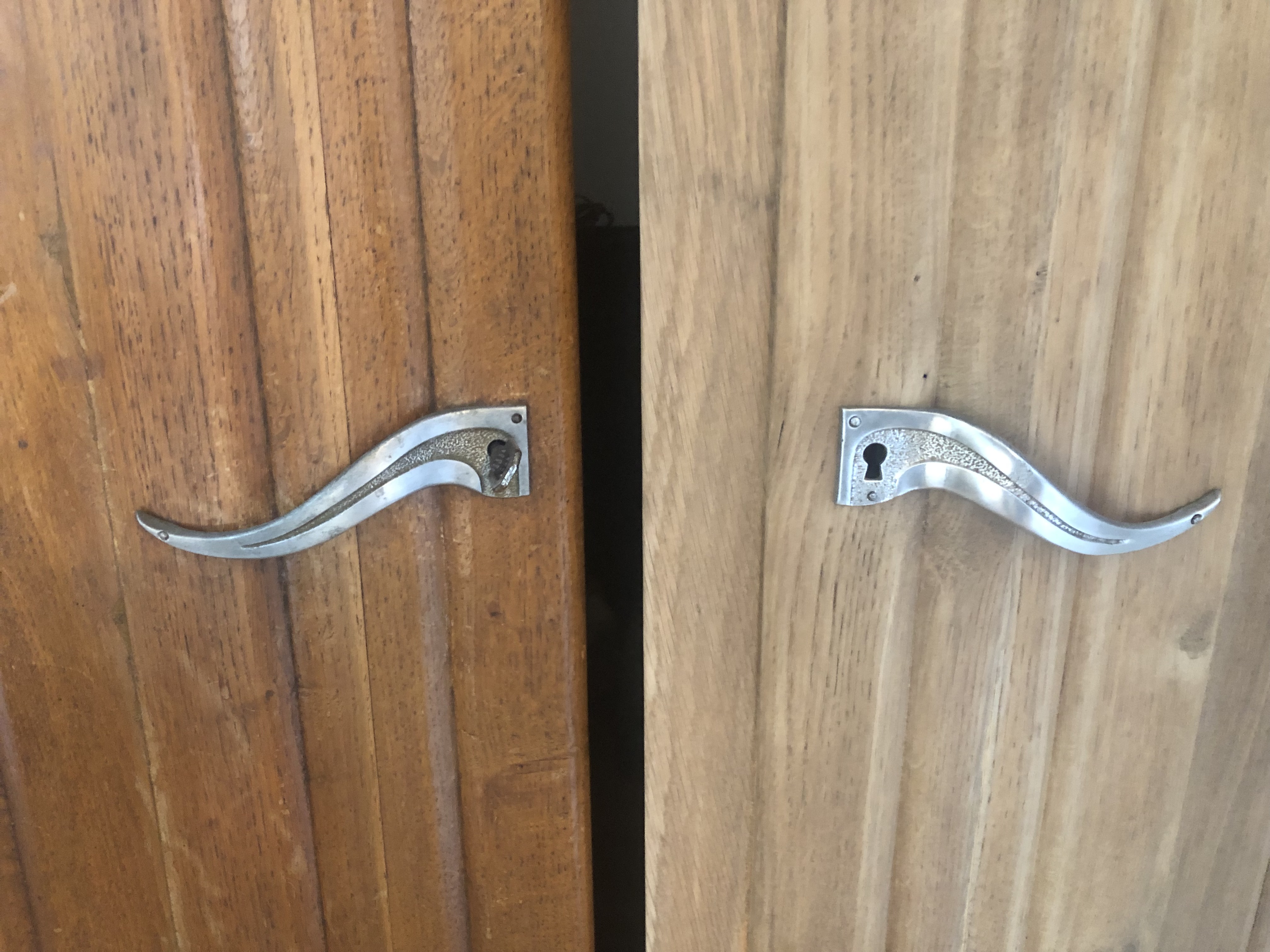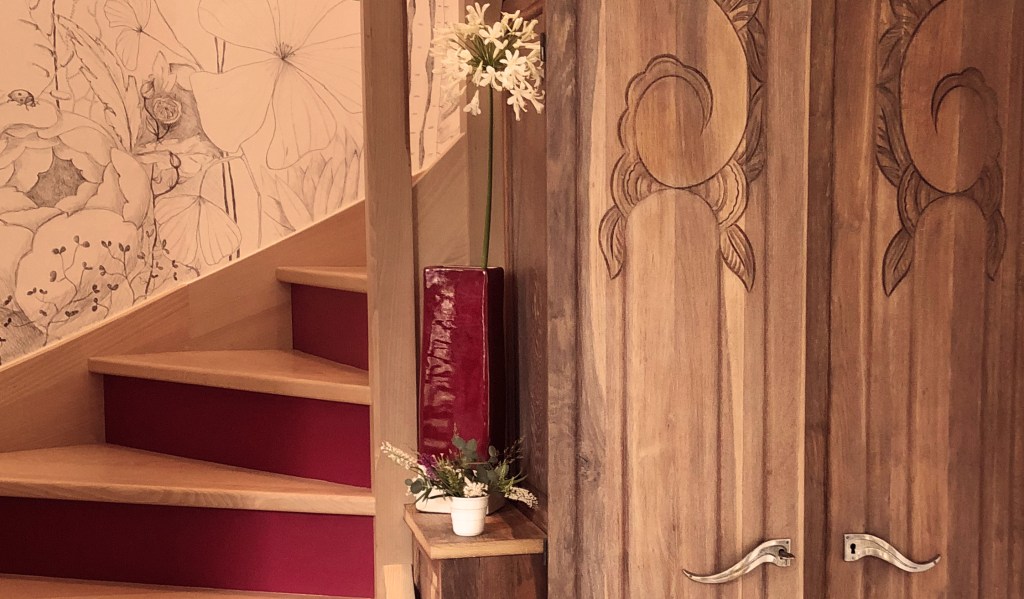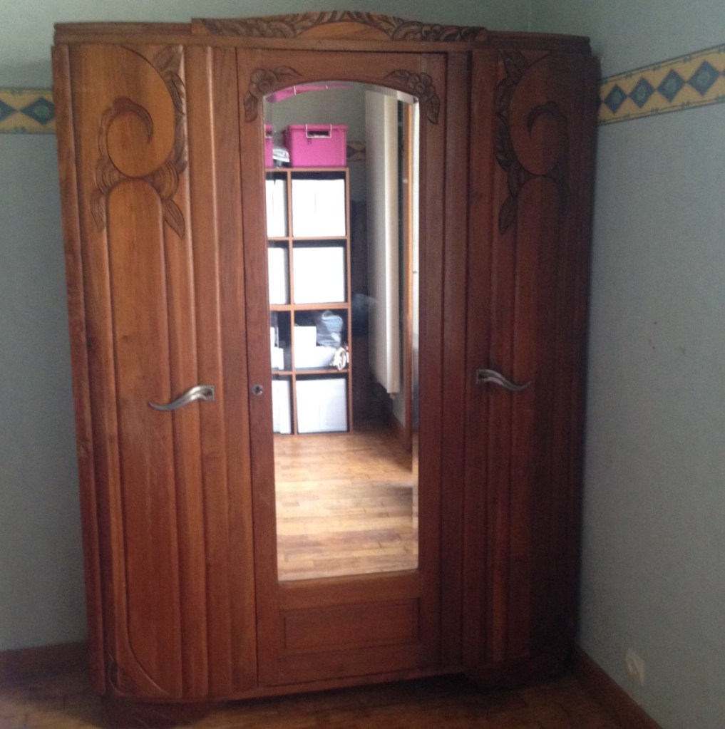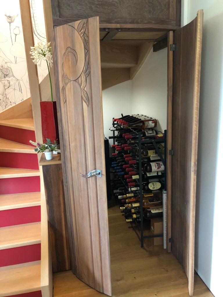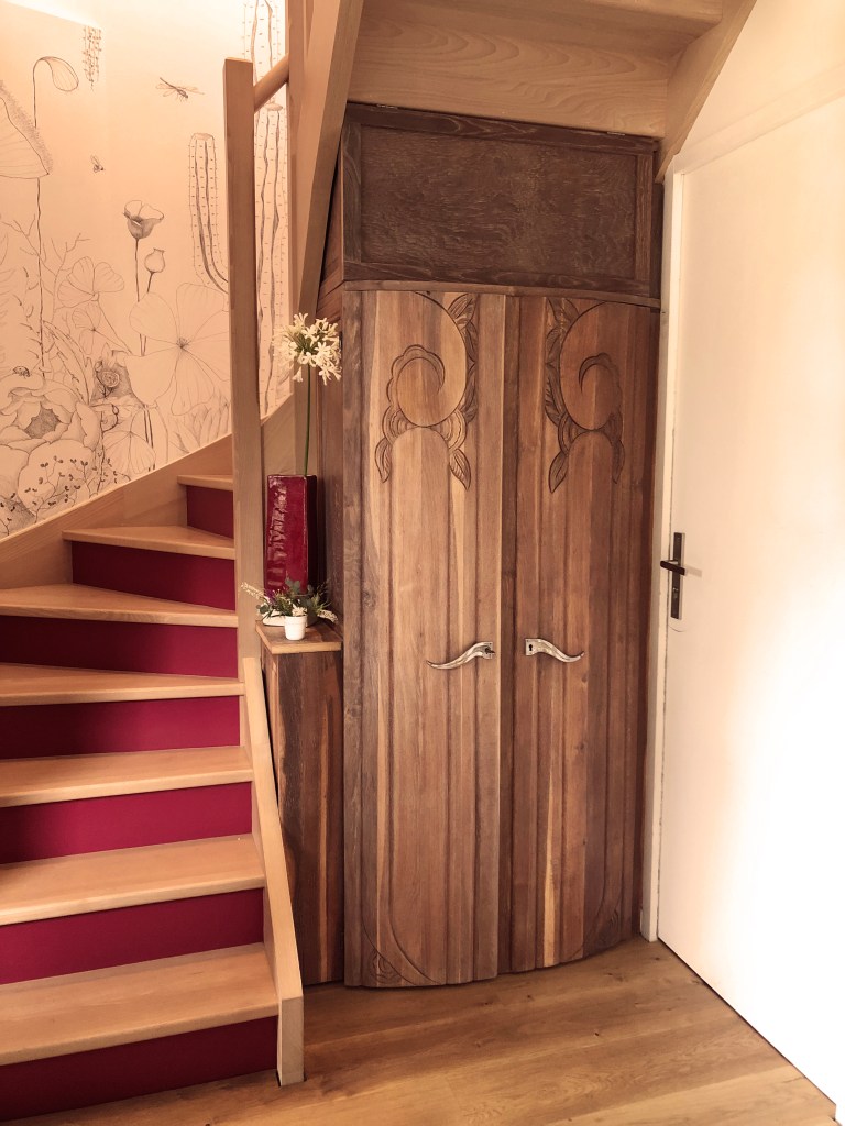 Un espace sous escalier avec du bazar à cacher + une armoire chinée = un nouveau meuble 100% récup. Beaucoup d’huile de coude pour retirer les couches de vernis, poncer, et huiler par la suite. L’armoire a été démontée, coupée ; je n’ai gardé que les portes des côtés (le miroir est utilisé ailleurs) et remis à dimensions pour s’adapter à l’espace que j’avais ici. Les montants de l’armoire ont servi à ajuster les portes. Ce meuble surprend quand on ouvre ses portes et qu’on y découvre tout un espace caché derrière.