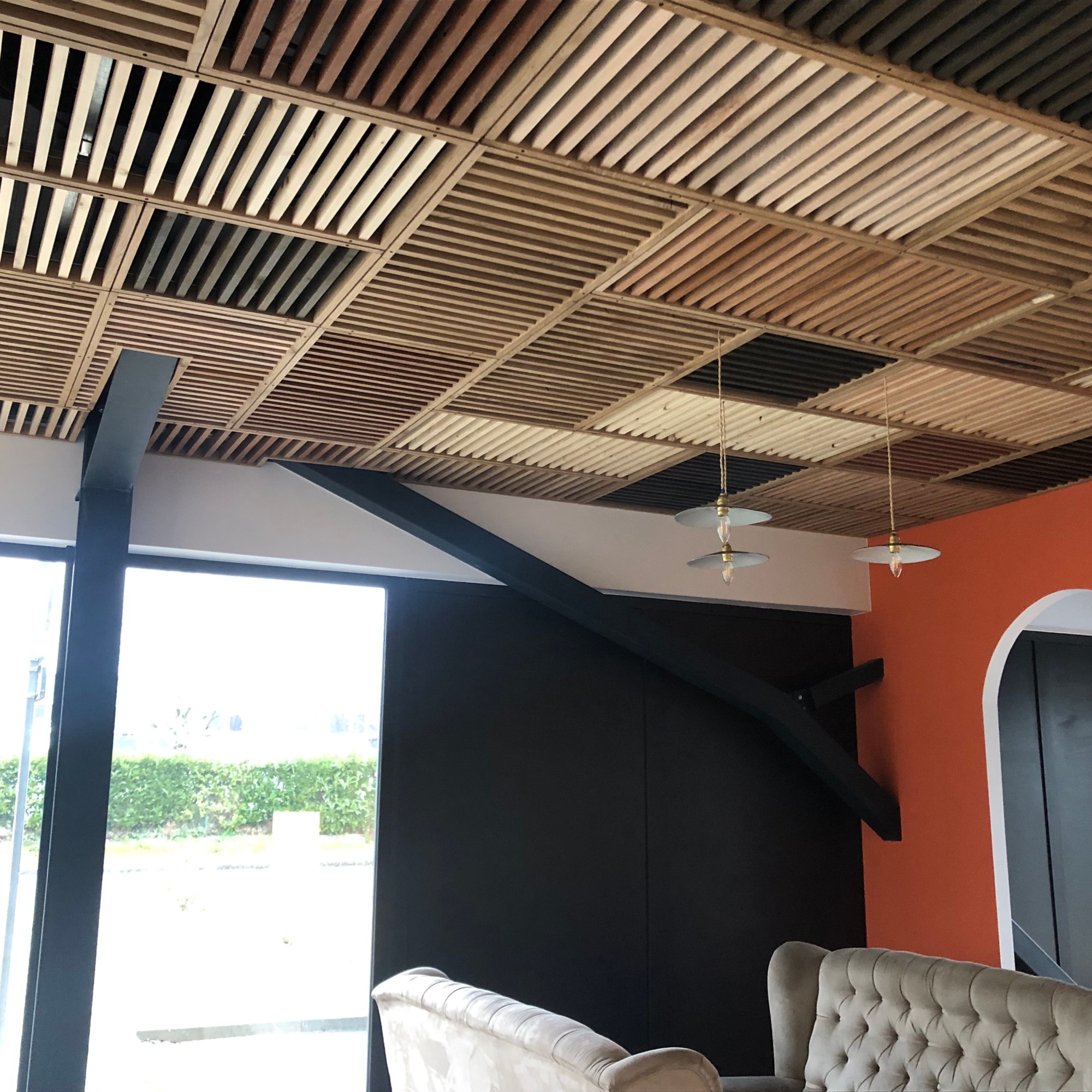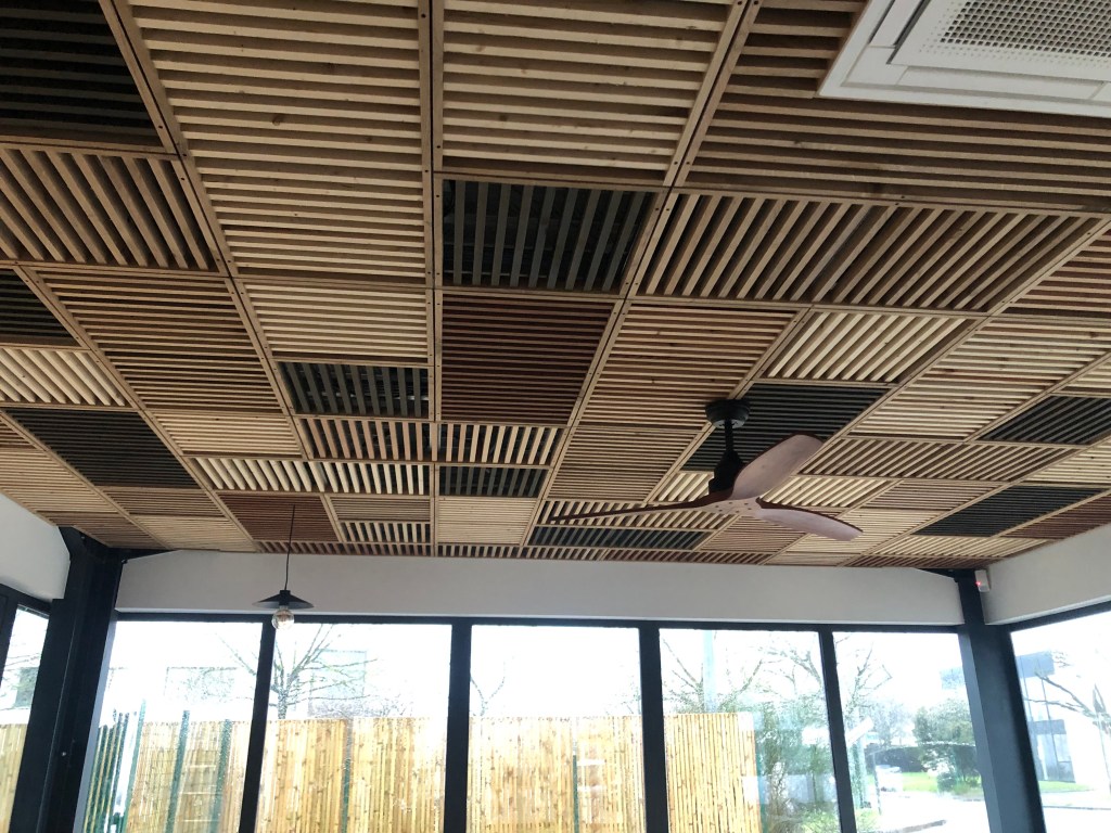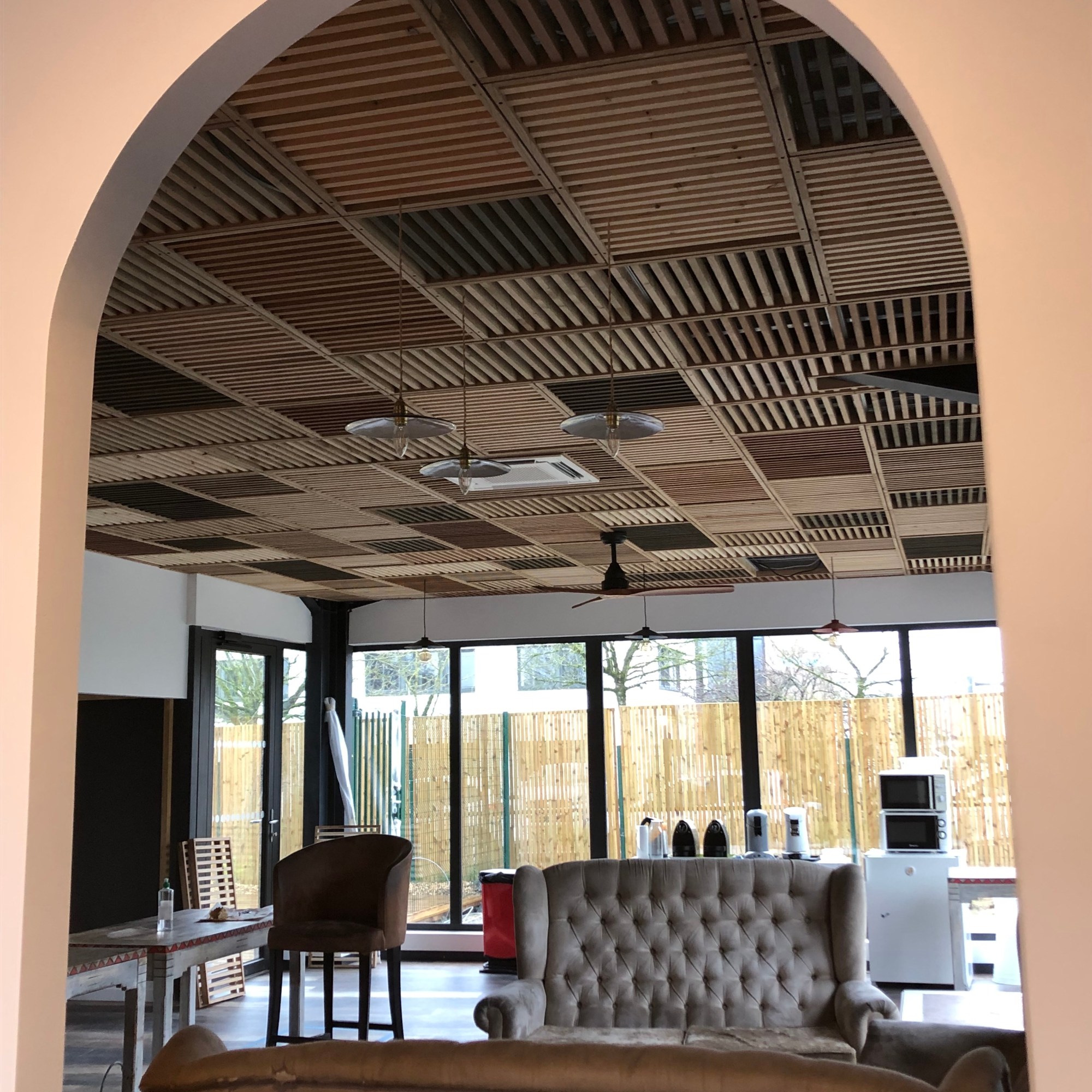 La demande était la suivante : rendre chaleureux l’espace détente de 54m2 du coworking, avec comme thématique Cuba. Après différentes propositions, et l’envie de travailler du bois de réemploi pour la 1ère fois, voici le rendu !