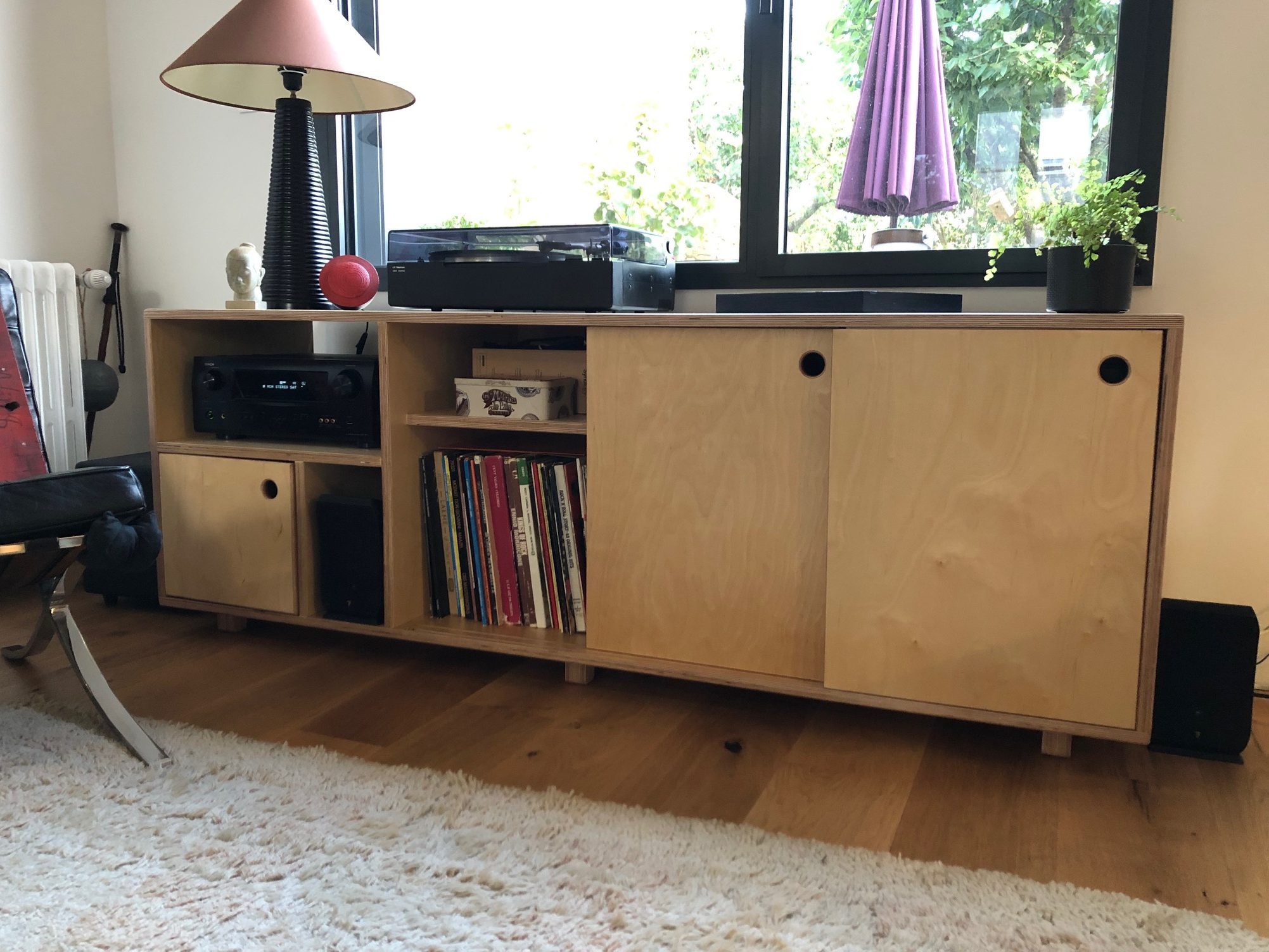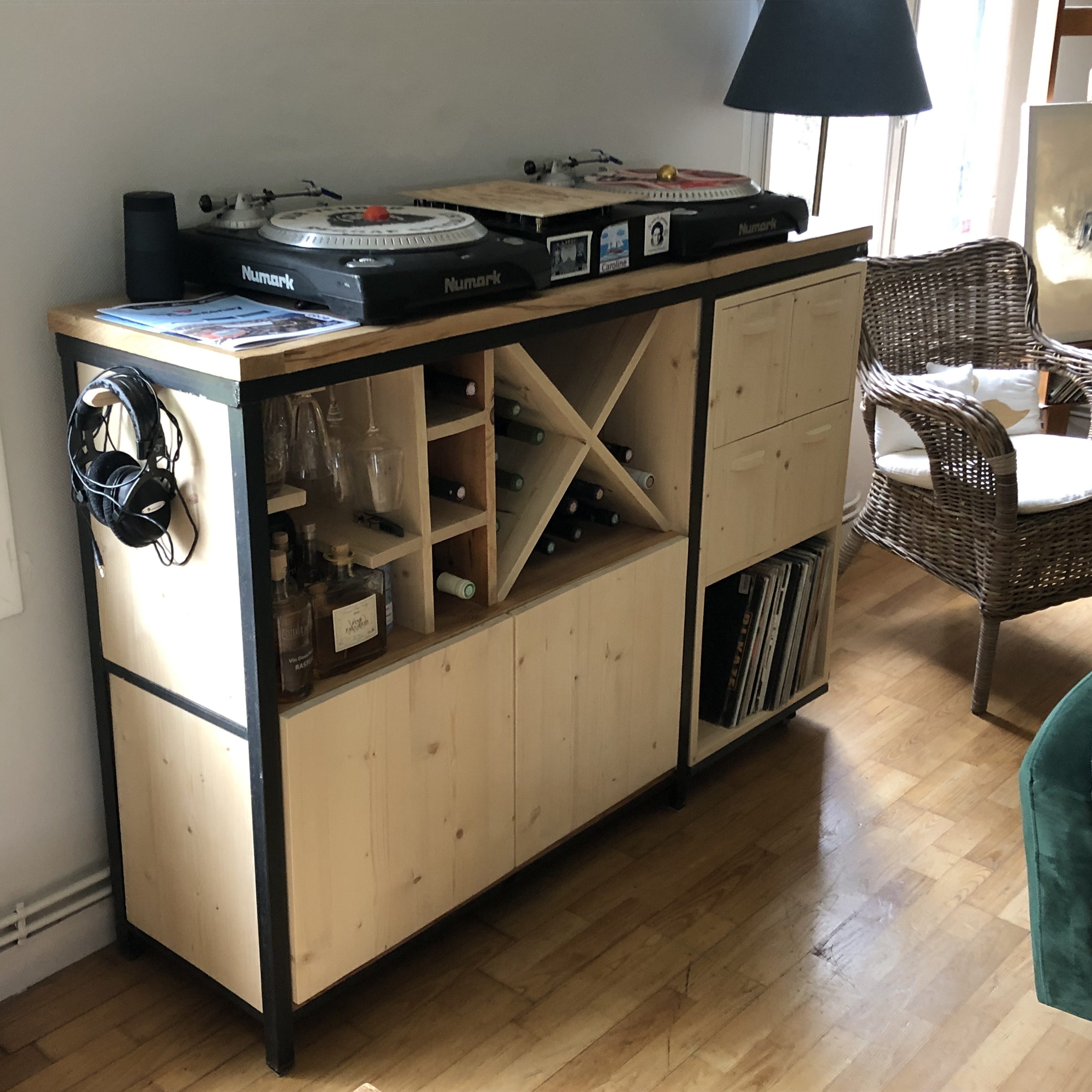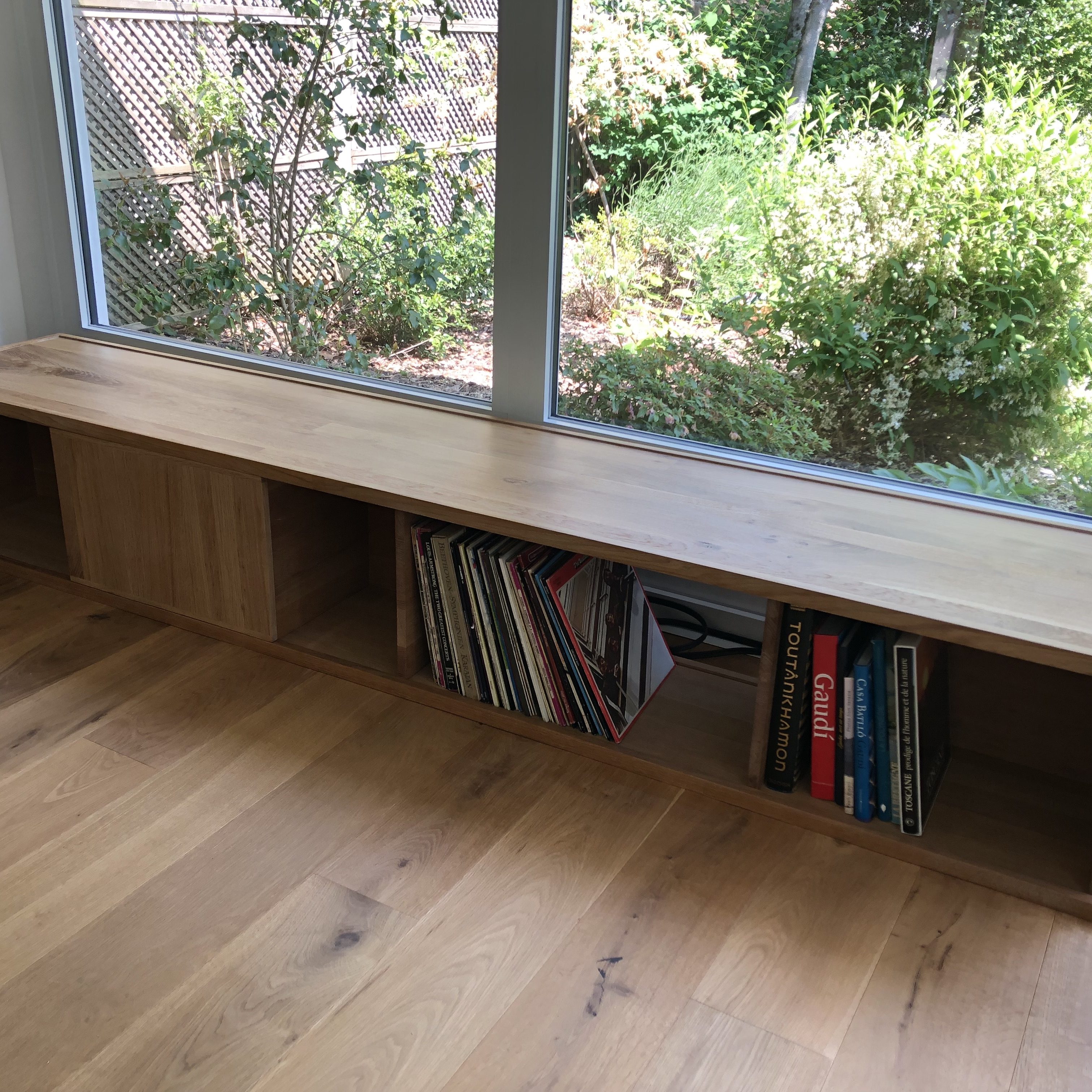 Bibliothèque ZBancMeuble TVMeuble vinyle & vinTable en chêne massifBanc & rangementRangement bas à vinylesEtagères en fixations invisiblesBibliothèque sur mesure